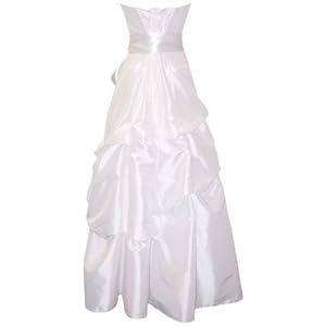 Gorgeous taffeta strapless dress with boned bodice, full skirt with pull-ups, floor length, fully lined with tulle petticoat, wide detatchable satin ribbon belt, matching scarf and optional spaghetti straps included, zip back with corset cinch tie for a good fit. Junior sizes XS-3X.